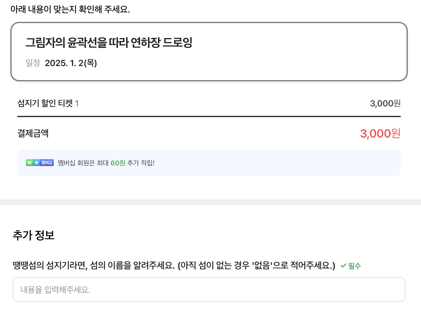 A. 예약하실 때 '섬지기 할인 티켓'을 선택하고 추가 정보에 섬의 이름을 적어주시면 서사장이 확인 후 티켓 1매를 직접 차감해요. 단, 예약 시 입력한 휴대폰 번호와 아무 모임 참가권 적립 시 입력한 휴대폰 번호가 다르면 섬의 정보를 찾을 수 없어 확인을 위해 따로 연락을 드릴 수 있어요.