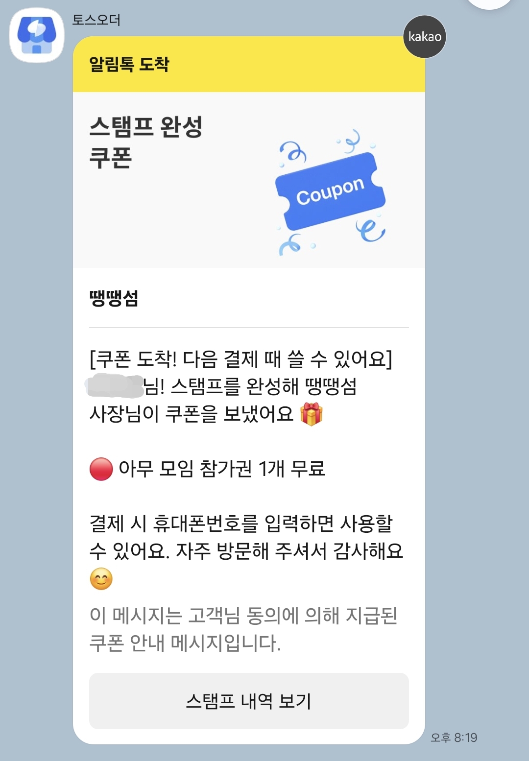 A. 카카오톡 채팅 이력에서 '토스오더'를 검색해보세요. 적립 내역을 확인할 수 있어요.