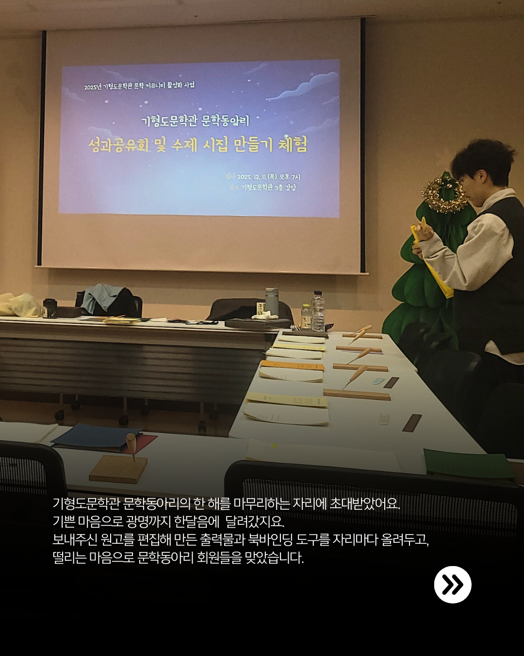 보내주신 원고를 편집해 만든 출력물과 북바인딩 도구를 자리마다 올려두고, 떨리는 마음으로 문학동아리 회원들을 맞았습니다.