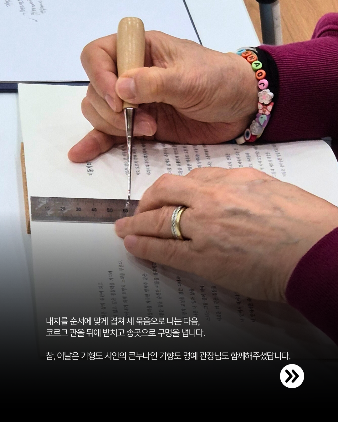 시인 다운의 설명에 귀 기울이며 말 그대로 책을 '엮어' 냅니다.